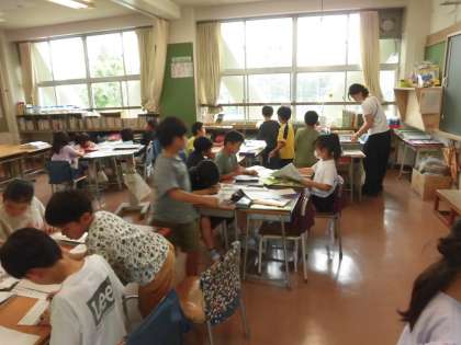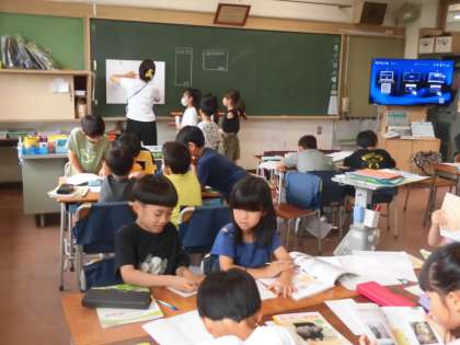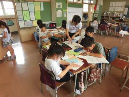 班の形にして、学習したことをまとめています。話し合いをしながら、みんなで進めている班、一人ひとり個別に作業を進めている班など、作業の仕方に違いはあれど、みんな一生懸命に学習に取り組んでいます。一生懸命な姿勢がとてもすてきです。