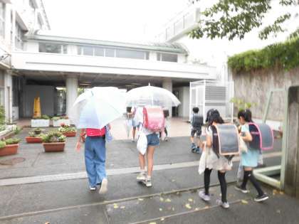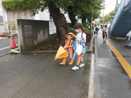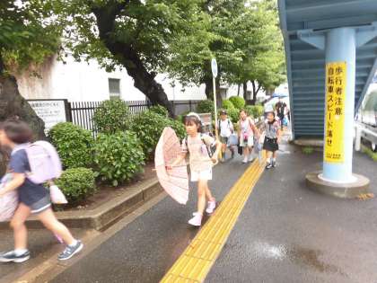 子どもたちの登校時刻は、雨が降っていませんでした。少し前まで降っていたからでしょうか、かさをさして歩いている人もいます。