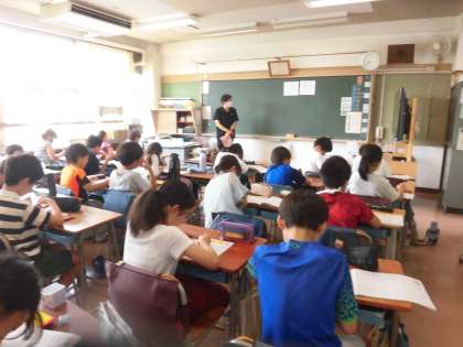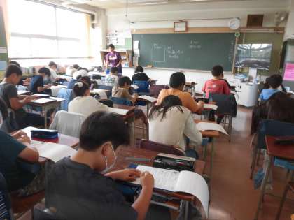 先生からの手本の提示の後、子どもたちはドリルやノートに練習をしています。漢字は