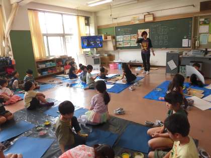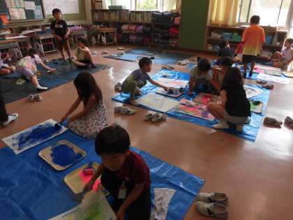 1年生の授業は図工です。教室の机や椅子を後ろに片付けて、広いスペースを作って作品作りをしています。ブラシやローラーを使って模様をつくっています。