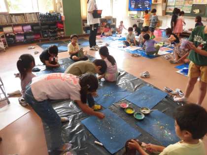 子どもたちは、ローラーやブラシを楽しそうに使って、思い思いの模様をつくっています。