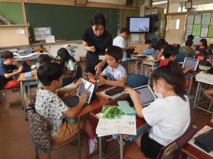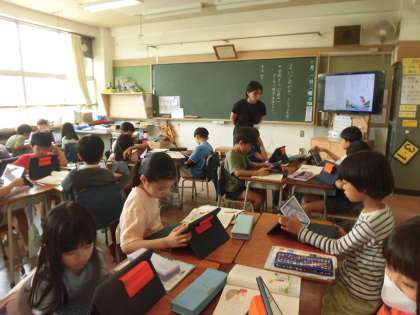 子どもたち一人ひとりが考えた「問い」をクラスのみんなで確認しています。タブレットでみんなが見ています。教室が静かになっています。友達の考えに興味がある証拠です。