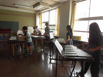 担当する楽器に分かれて、練習をしています。担当ごとに声を掛け合っています。