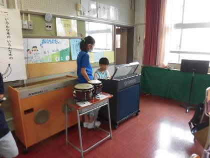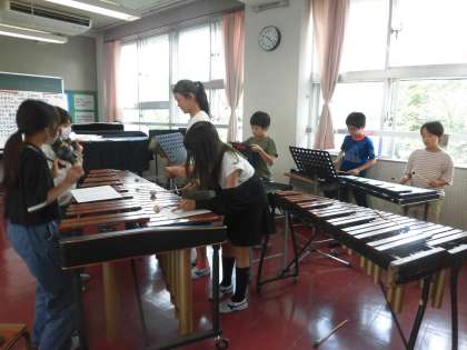 5年生の授業は音楽です。合奏の練習をしています。曲名は「キリマンジャロ」です。