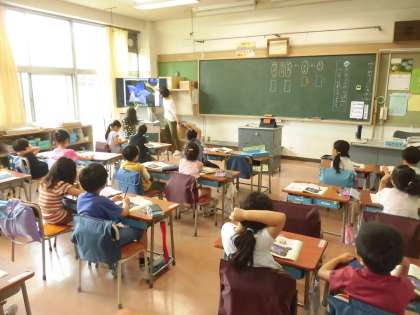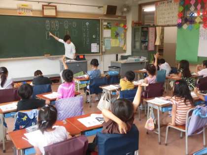 子どもたちが、「とい」や「こたえ」について、教科書の挿絵を使って説明しています。