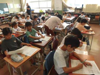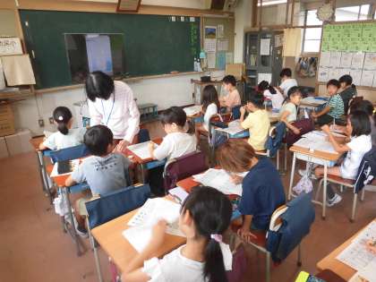 ワークシートに漢字をていねいに書いています。一生懸命に取り組んでいる2年生です。