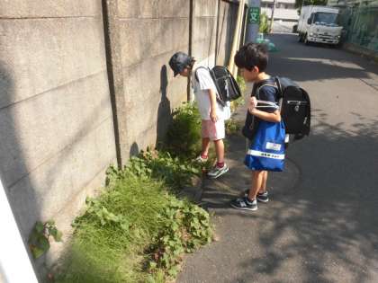 とかげを見つけたようです。草のしげみを見てみると、確かにとかげが動いています。しっぽまで合わせると、10cmをこえるような大きさです。しかし、さっと草の影に入ったあとは、もう見つけることはできませんでした。