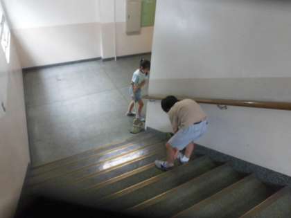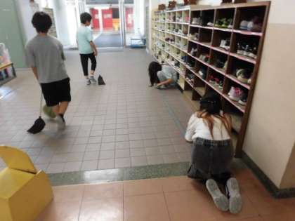 もくもくと階段のごみをとる人、昇降口にひざをついてほこりをとる人などがいます。一生懸命に働く姿は、見ているだけでいい気持ちになります。
