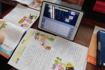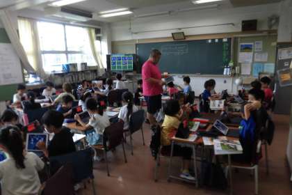 2年生は道徳の授業です。相手によって態度を変えることについて、物語を通じて考えていました。タブレット端末のアプリ「ロイロノート」を使って、2つの立場から自分たちの考えを伝え合いました。2年生でもシンキングツールを使っている様子に驚かされました。