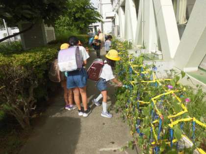早く登校した1年生がアサガオに水をあげています。その近くには6年生がいます。6年生はいつも1年生を見守ってくれています。