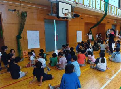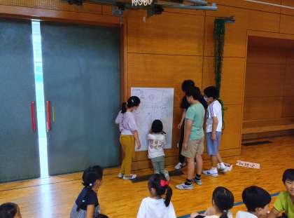 たてわり班で集まり、テーマについてみんなで絵を描いています。自分が描く番になると、みんな楽しそうにペンを動かしています。待っているときも、1年生と6年生は一緒です。