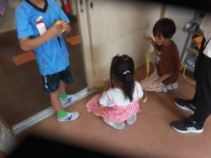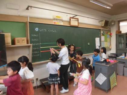紙テープの端と端を持ち合い友達と協力しながら、長さをはかっていました。