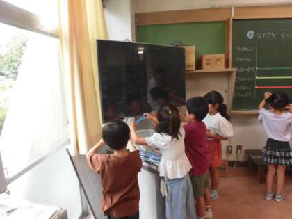扉の横の長さやテレビの横の長さなど、紙テープを使って調べています。その紙テープを黒板にはっています。こうすると、長さの違いがよく分かります。