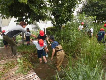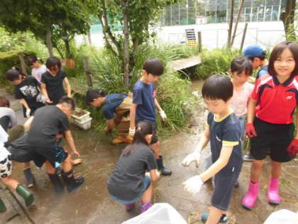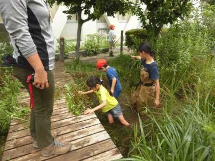 今日は、ビオトープに生えている余分な草などを抜きます。長靴を用意してきた子どもたちですが、長靴の長さが足りずに、長靴がずぶぬれになっている人もいます。しかし、子どもたちは一生懸命に草を抜いています。