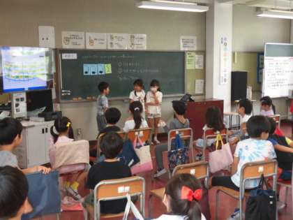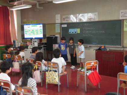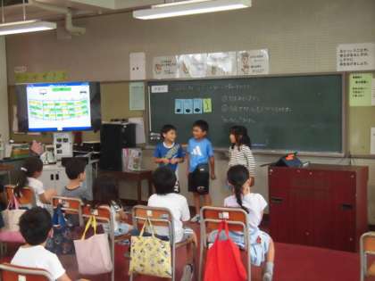 2年生の授業は音楽です。友達と声をつなげたり重ねたりして音楽をつくろうという授業です。グループで前に出てきて発表しています。自分たちで考えたいろいろな音をつなげて発表しています。最初は恥ずかしそうにしていましたが、一度やったあとに「もう一回やりたい。」と言っている人もいました。