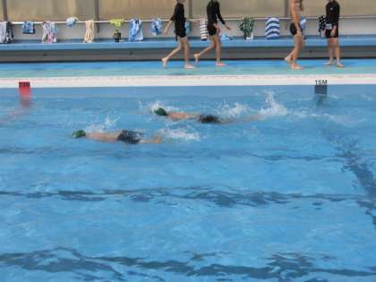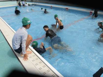 クロールの練習や平泳ぎの練習をしています。平泳ぎの練習では、足での水のかき方や、手と足のコンビネーションなどを水の中で教えてもらっていました。