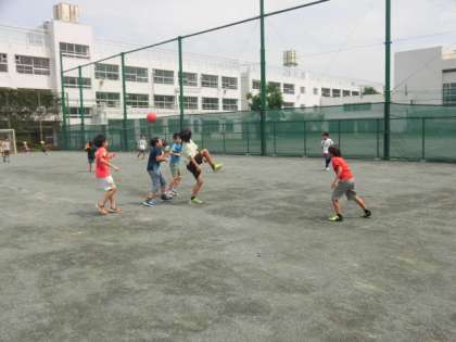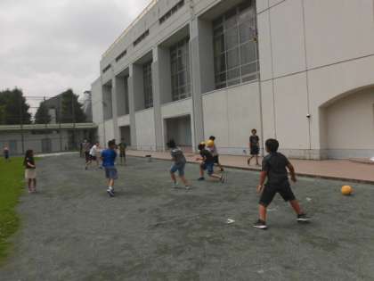 ドッジボールをする6年生、サッカーをする5年生がいます。ジャングルジムを見ると、上にのぼっている大きな子どもがいました。落ちないように気を付けてほしいです。