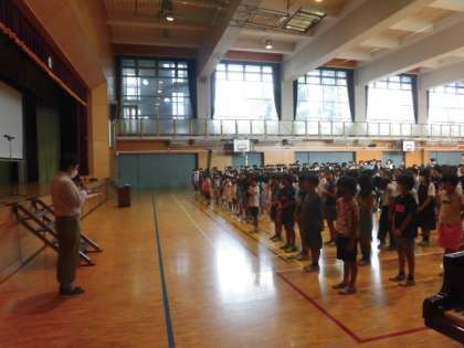 始まる前から、体育館は静かになり、子どもたちは姿勢よく始まるのを待っていました。子どもたちの1学期最後の式という意識を強く感じました。
