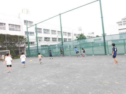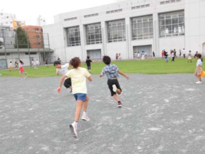 子どもたちが校庭で遊んでいます。日差しがあり暑さはありますが、子どもたちは元気です。