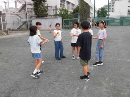 途中、校庭にところどころで、円をつくりじゃんけんをしている人たちがいます。おにごっこのオニ決めをしています。