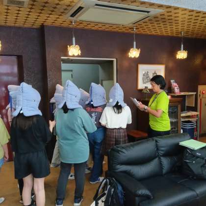 班長さんが中心となり、防災頭巾と避難経路の確認をしました。