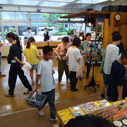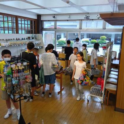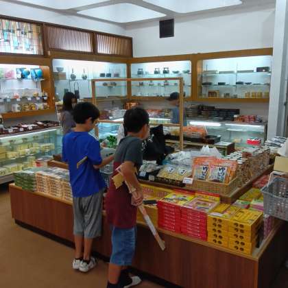 お土産選びでは、お小遣いと商品を真剣な表情で見比べて買う物を決めています。