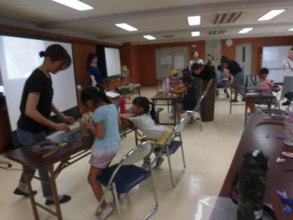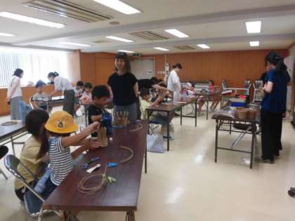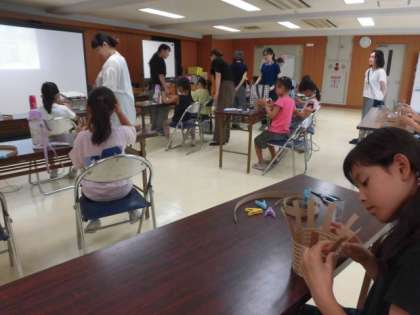 細い紙バンドを編んで、筒状にしていきます。低学年の子どもたちもとてもきれいに作品をつくっています。わたしは手先が不器用なので、子どもたちのように作ることはできないと思います。こどもたちが作っている作品を見て、感心ばかりでした。