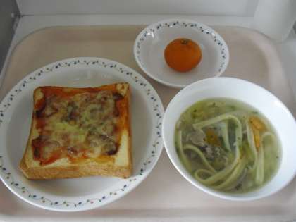 ピザトースト 牛乳 ヌードルスープ 冷凍みかん