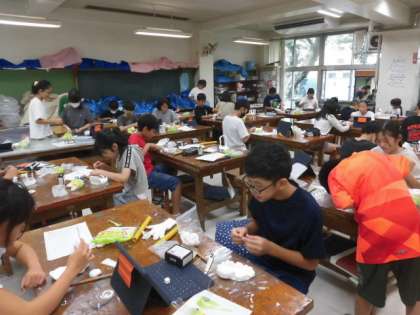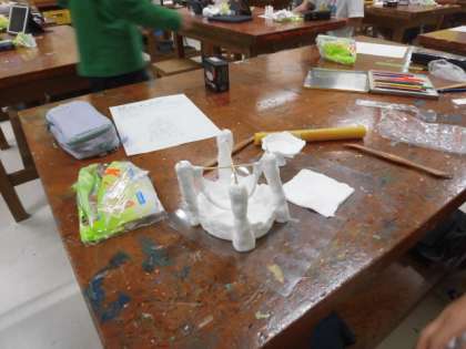 紙粘土で土台をつくり、ライトを埋め込んでいきます。子どもだちの作っているものを見てみると、基本の形がとても個性的です。丸みのあるデザインのもの、平面の印象の強いもの、支柱の使い方に個性のあるもの等、いろいろあります。その子その子の個性があふれていて、仕上がりがとても楽しみです。