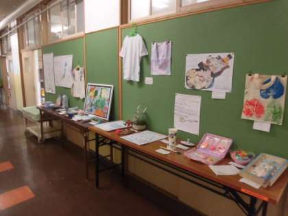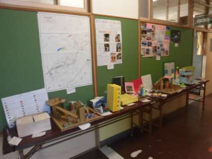 1年生の教室の廊下には、子どもたちの夏休みの自由研究の作品が展示してあります。