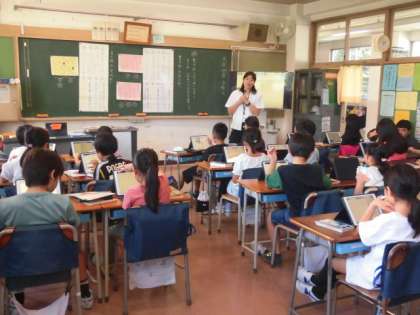 国語の読書感想文の授業です。たくさんの先生が見ている中でしたが、子どもたちは自分の感じたことを書き進め、自分の書いた文章を紹介したり認め合ったりしながら意欲的に学習をすすめていました。