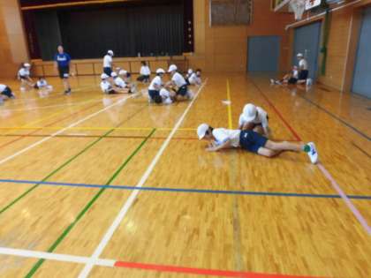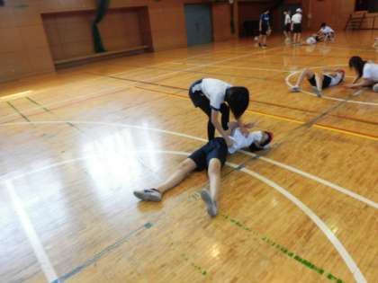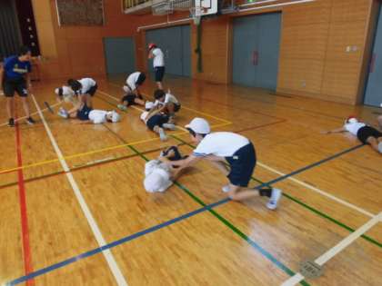 6年生の授業は体育です。体育館でからだほぐしの学習をしています。2学期が始まって4日、心と体をほぐしています。焼き芋にでもなったかのように、寝ている人は力を抜いて友達に身体を回転させてもらっています。そのあとは、地面に張り付いた貝のように回転させられないように踏ん張っています。