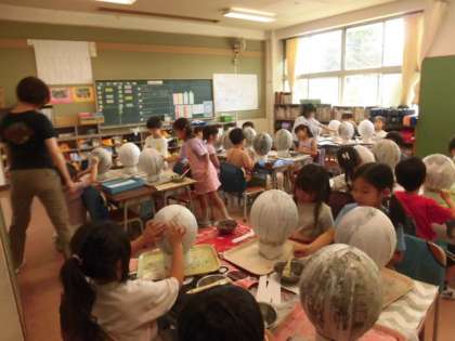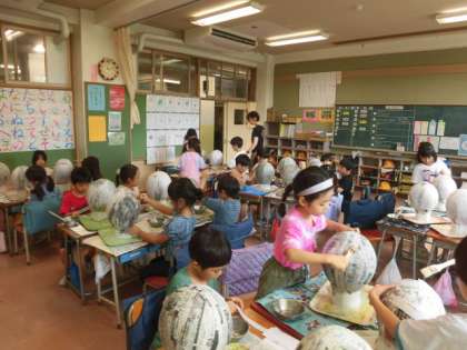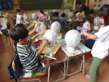 風船に新聞紙や半紙を張り付けています。風船でつくったこの球型が気球の風船になります。子どもたちは夢中になって紙を張り付けています。