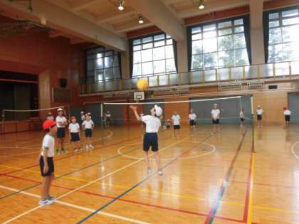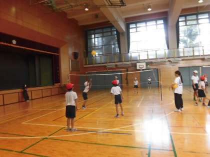 ボールをはじく動きのあるバレーボールに比べると、キャッチがあることでボール操作が格段に易しくなります。どのようにしたら得点が取れるか作戦を考え、ゲームを行っていました。