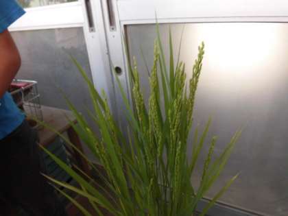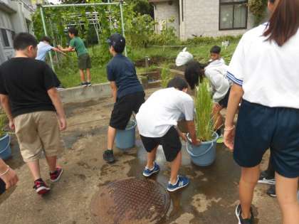 5年生がピンク門のところに置いてあるバケツ稲の世話に来ました。今日は、水を抜いて、中干しをするそうです。朝見たものには、成りのよくない稲もありましたが、よく見ると、しっかりと身の詰まっているものも多くあります。収穫が楽しみです。
