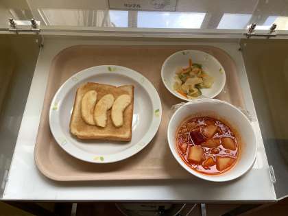 牛乳・シナモンりんごトースト・野菜のイタリアンドレッシングかけ・ボルシチ