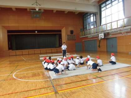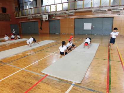 はじめ、マットの学習の仕方や約束について確認をしました。そのあとに、マットでいろいろな動きをしました。子どもたちは、腕でしっかりと体を支えています。
