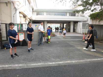 今日は三宿中学校のお兄さんお姉さんがやってき、池尻小学校の門で、あいさつ運動をしてくれました。来てくれて人たちは、みんな池尻小学校の卒業生です。