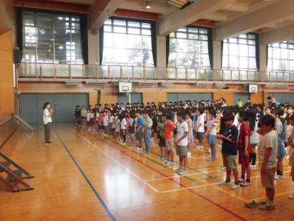 今日は月曜日、全校朝会の日です。まだまだ暑さが厳しいので体育館で行いました。