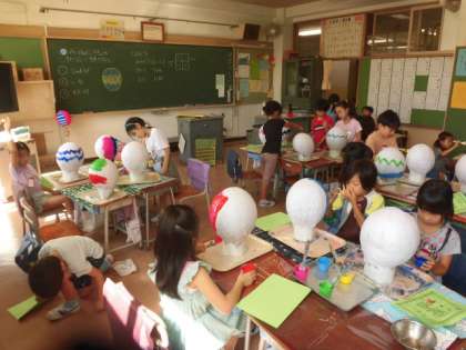 風船に新聞紙や半紙を張り、そこに色を塗っていきます。