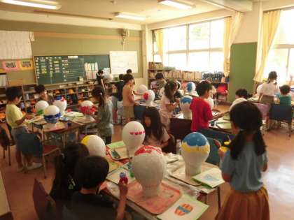 1年生の授業は図工です。風船を膨らませて気球を作っています。