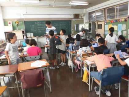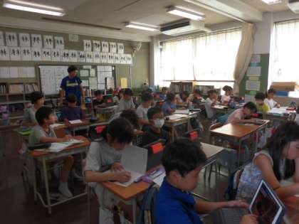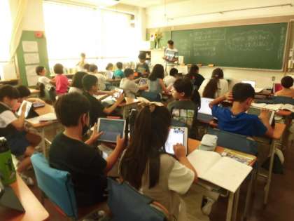 子どもたちはタブレットを活用して、調べ学習をしています。