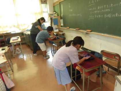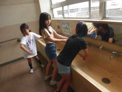 水道場の前を歩いていると、3年生が一生懸命に手を洗っています。「なんでそんなに一生懸命手を洗っているの?」と聞いてみると、「保健の授業だよ。」「ハンカチで拭いてはいけないんだよ。」と教えてくれました。