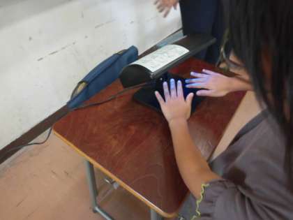教室に行ってみると、手を洗った人は、乾かしてチェッカーに手をかざしています。事前につけたチェッカーに反応する液剤が手洗いで落ちているか確認しているのです。手がきれいなった人は満足そうです。指先やつめの回り、指の付け根がなかなか落ちないようです。「もう10回手を洗ってるよ。」そんな人もいます。