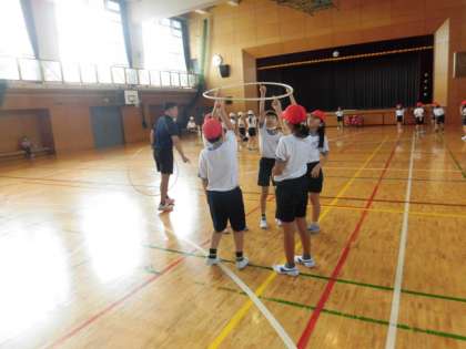友だちと気持ちを合わせないと、フープはきれいに上に上がりません。4人でできたところは、人数を増やして取り組んでいます。