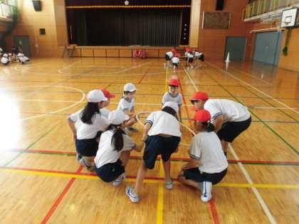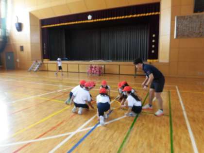4年生の授業は体育です。体育館でフープを使った運動をしています。