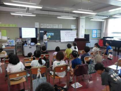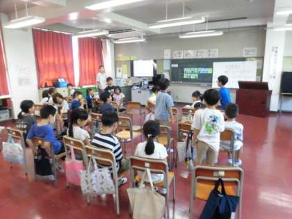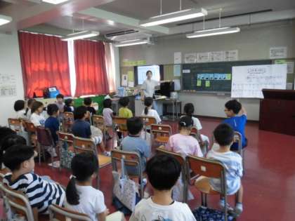 2年生の授業は音楽です。リズムの学習をしています。「タン・タン・タ・タ・タ」などのリズムを足を使って、奏でています。子どもたちは体を動かすのが大好きです。みんなとても楽しそうです。