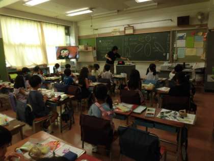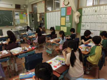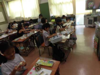 1年生の授業は図工です。気球に乗る自分を紙粘土でつくっています。絵の具を混ぜ、洋服に色も付けています。今日自分が来ている服と同じ色で塗っている人がたくさんいます。たくさんの人が、「見て、見て。」と、声をかけてくれます。とても楽しそうに作品作りをしています。