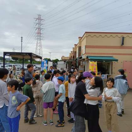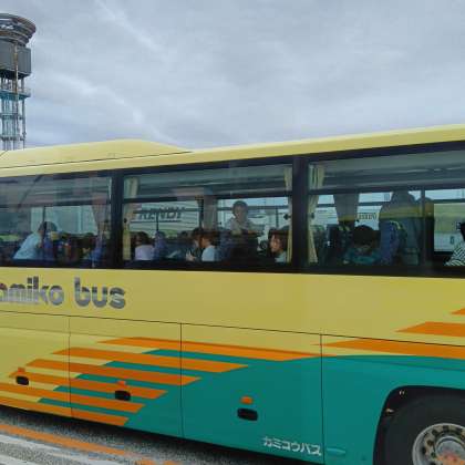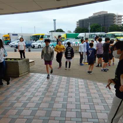 子どもたちを乗せたバスは、関越自動車道の三芳パーキングエリアに着きました。トイレ休憩です。少しバス酔いした人もいましたが、みんな元気です。ニコニコでバズを降りてきます。