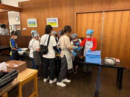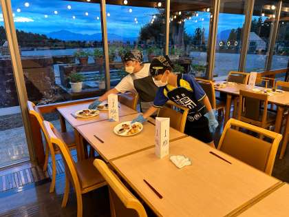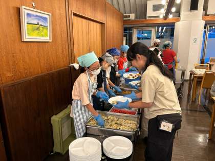 夕食の準備を食事係の人たちがしてくれています。食事の準備も2回目になり、流れがとてもスムーズです。係の人は、とても静かに準備をしています。